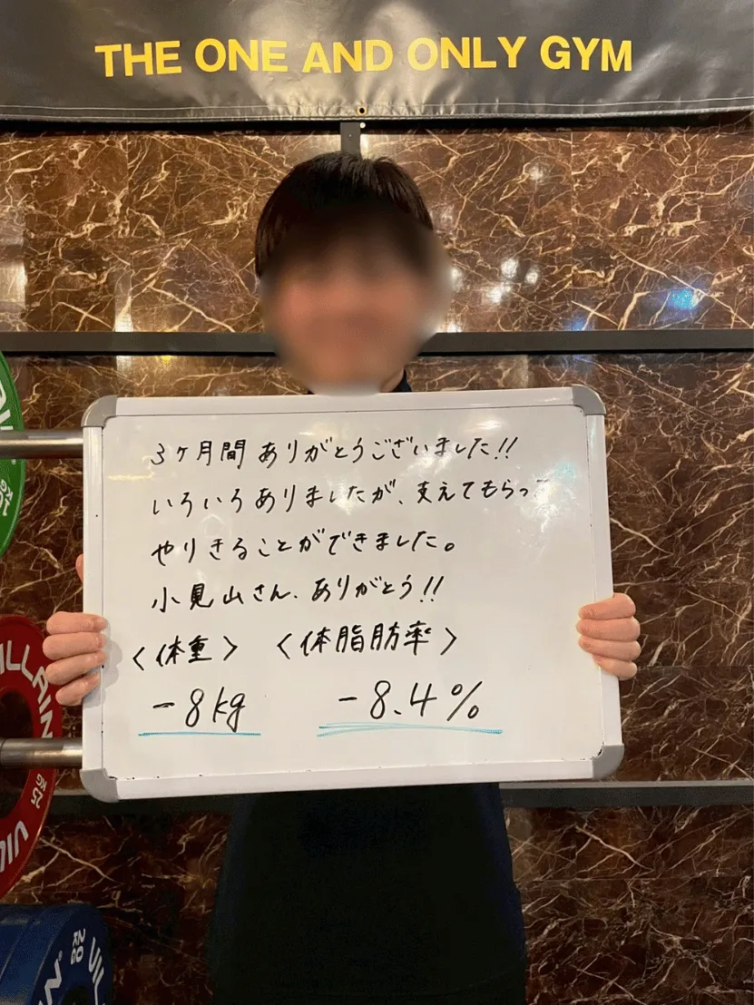 最初のうちはなかなか結果につながらず、何度も相談を重ね、試行錯誤を繰り返していきました。体調が崩れる時期が続いても「どうすれば前に進めるか」を一緒に考え、行動を止めませんでした。忙しさでジムに来られない日があっても、気持ちは切らさなかった。来れた日は疲労があっても妥協せず、トレーニングで自分を追い込む。その積み重ねが最終的な大きな成果につながりました。